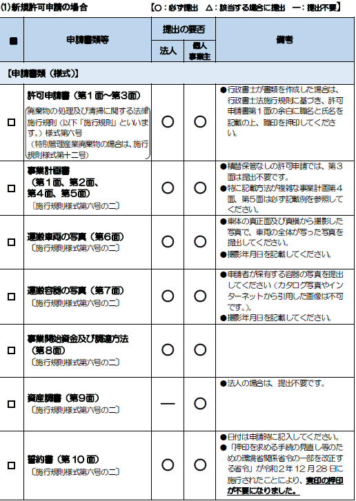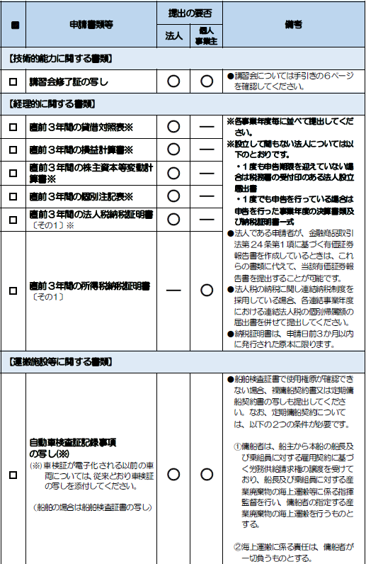 許可申請は、定められた様式に加えて、事業計画の概要、環境保全対策、施設の構造、財務状況などを証明する膨大な添付書類が必要です。