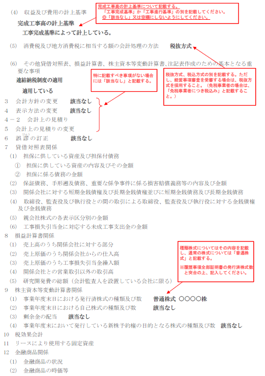 特に、経営事項審査(経審)を受ける業者様にとっては、注記表の記載内容が、審査の格付けに直結する財務諸表の信頼性を担保するものとなります。適当に書いてしまうと、審査時に厳しく指摘されたり、最悪の場合、虚偽記載とみなされるリスクかありますので注意が必要です。