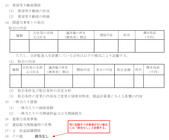 注記表には多くの項目がありますが、自社に関係のない項目、例えば、関連当事者との取引がない場合なども多いはずです。その際は、空欄のままにぜず、該当なしと記載する必要があります。