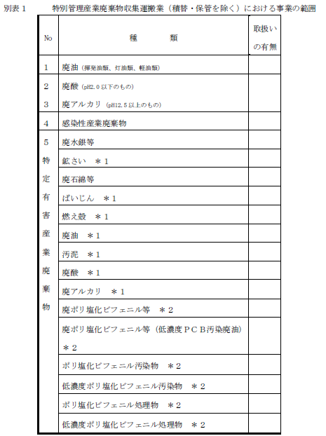 ここからが間違えやすいポイントです。上記のNO.1からNO.3とは別に、特定有害産業廃棄物としての廃油、廃酸、廃アルカリ(いずれもNO.5)を取り扱う場合、ここも忘れずにチェックを入れなければなりません。