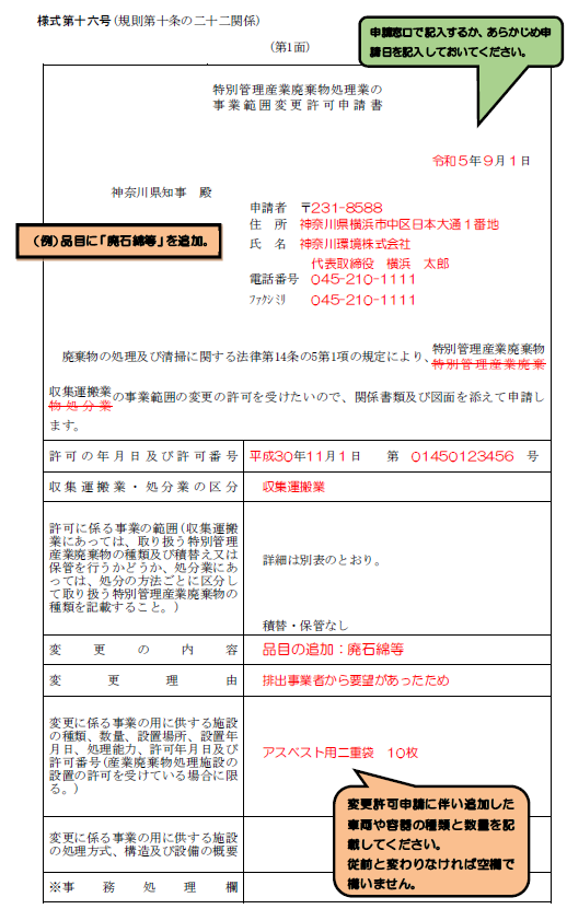 非常にシンプルですが、これを間違えると、どの品目を追加したいのかが行政庁に伝わりません。一目で現在の状況と、これからの計画がわかるように記載する必要があります。