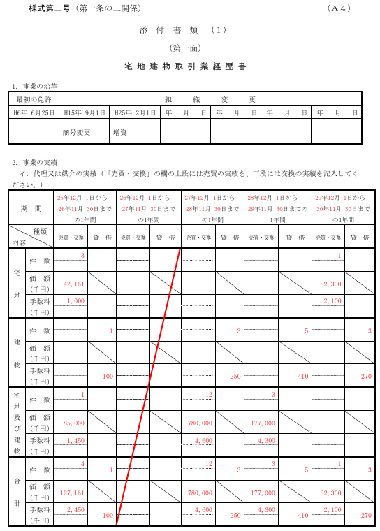 ・宅地建物取引業経歴書:会社が行った宅建業法上の取引のみを抽出した実績表です。