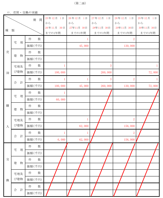 ・取引金額(実績事項):取引のある物件の売買代金そのものです。例えば、3,000万円の住宅を仲介したら、3,000万円と記載します。