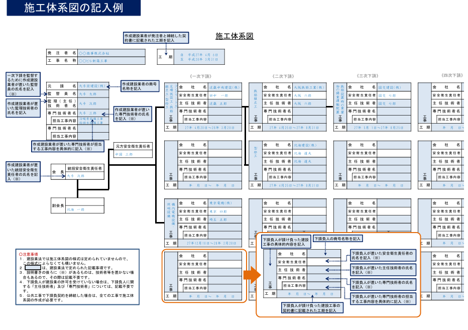施工体系図は、元請から一次、二次と続く下請負人までの全体構造を一目で分かるように図に示したもので、工事の指揮命令系の透明性を確保しています。