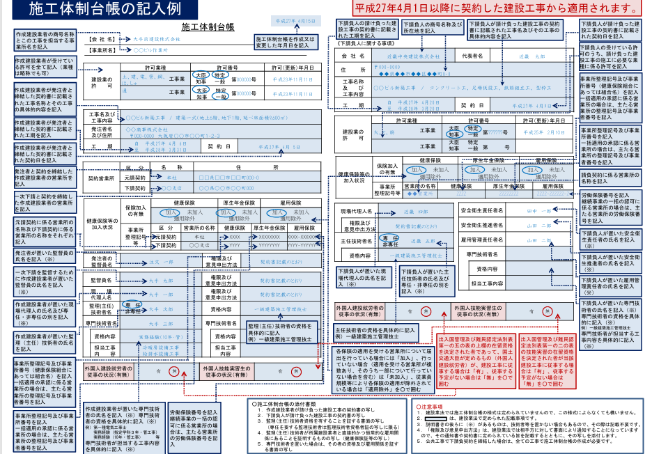 施工体制台帳は、工事全体に関わる以下の情報を記載する必要があります。